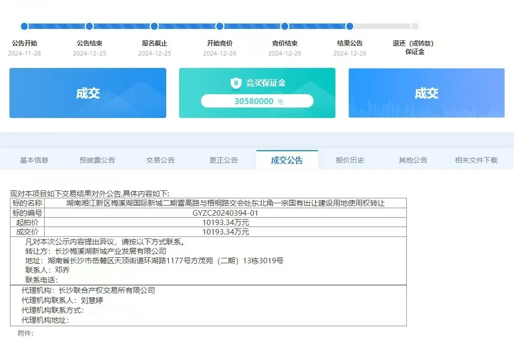 2024年12月26日,湖南湘江新區(qū)梅溪湖國際新城二期雷高路與梧桐路交會處東北角一宗國有出讓建設(shè)用地使用權(quán)轉(zhuǎn)讓項目通過長沙聯(lián)交所公開掛牌交易,成功征集到世界500強中國能建集團成員企業(yè)——易普力股份有限公司并以10193.34萬元順利成交。這意味著易普力成功落戶梅溪湖國際新城超級中軸,對推動產(chǎn)業(yè)升級、產(chǎn)城融合、區(qū)域發(fā)展意義重大。